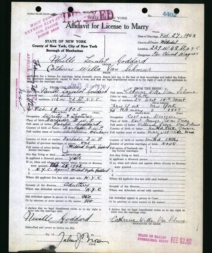 - Su certificado de matrimonio, aunque fechado el 27 de febrero de 1942, no fue presentado por el Secretario de la Ciudad hasta el 21 de octubre de 1943